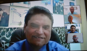 Online signing of MOU. In the big screen, Captain S.M.A Mahmoodi (MTI).From top to bottom: Rear Admiral (retired) Syed Imdad Imam Jafri (CEO Yohsin Solutions), Patrick Everts (General Manager TTC), Captain Ajmal Mahmoodi (Director MTI) and Captain Nauman Tirmizi (Director Yohsin Solutions)